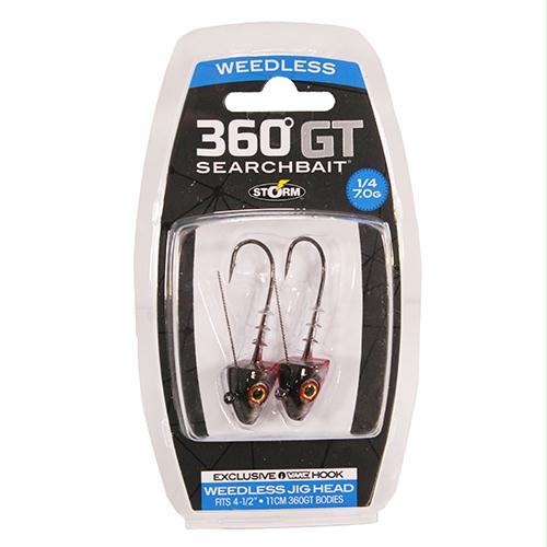 The 360GT Weedless Jig Head has a thin wire guard that allows you to fish in and around weeds with ease. Exclusive VMC Coastal Black hook with extended “leg” on line tie further enhances action. 60° angle keeps lure swimming in the perfect position. Life-like rattling jig head and 360GT bodies fit precisely, with color patterns that perfectly match regional forage.