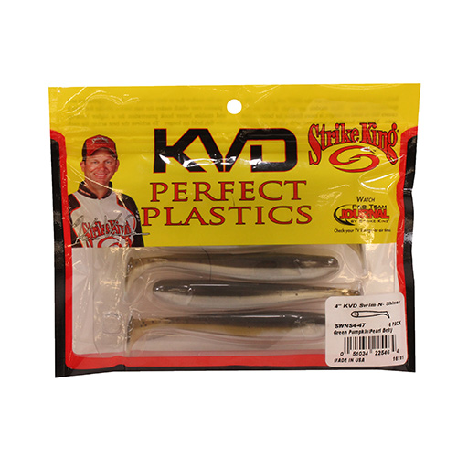 KVD Swim-N-Shiner Soft Bait Lure – 4″ Body Length, Green Pumpkin Pearl Belly, Per 6